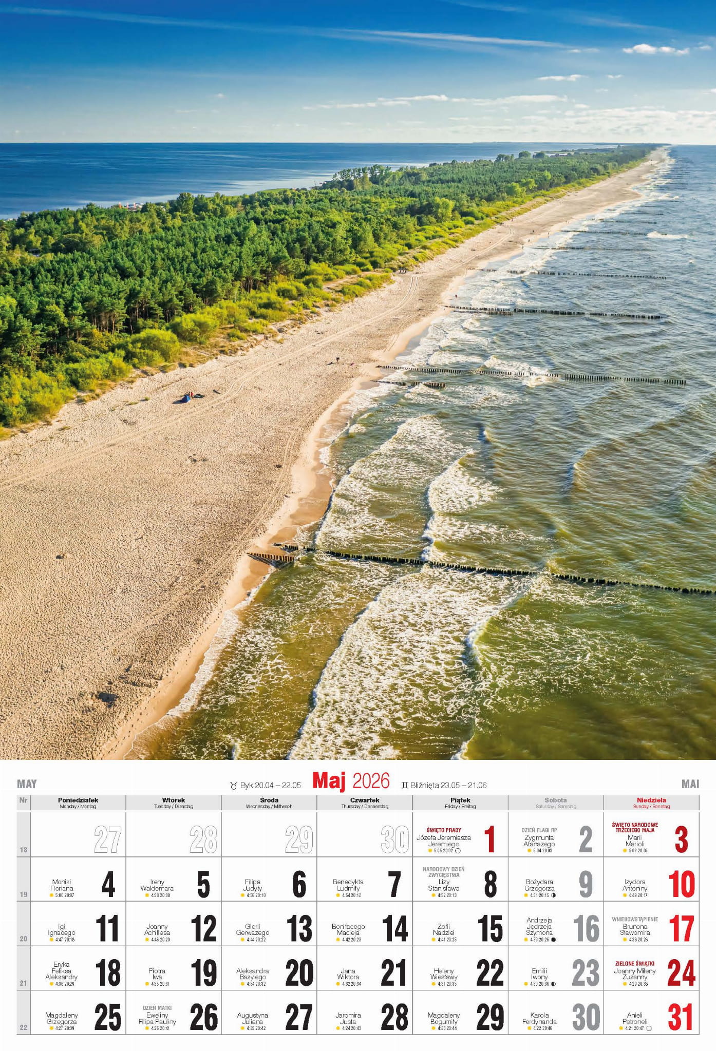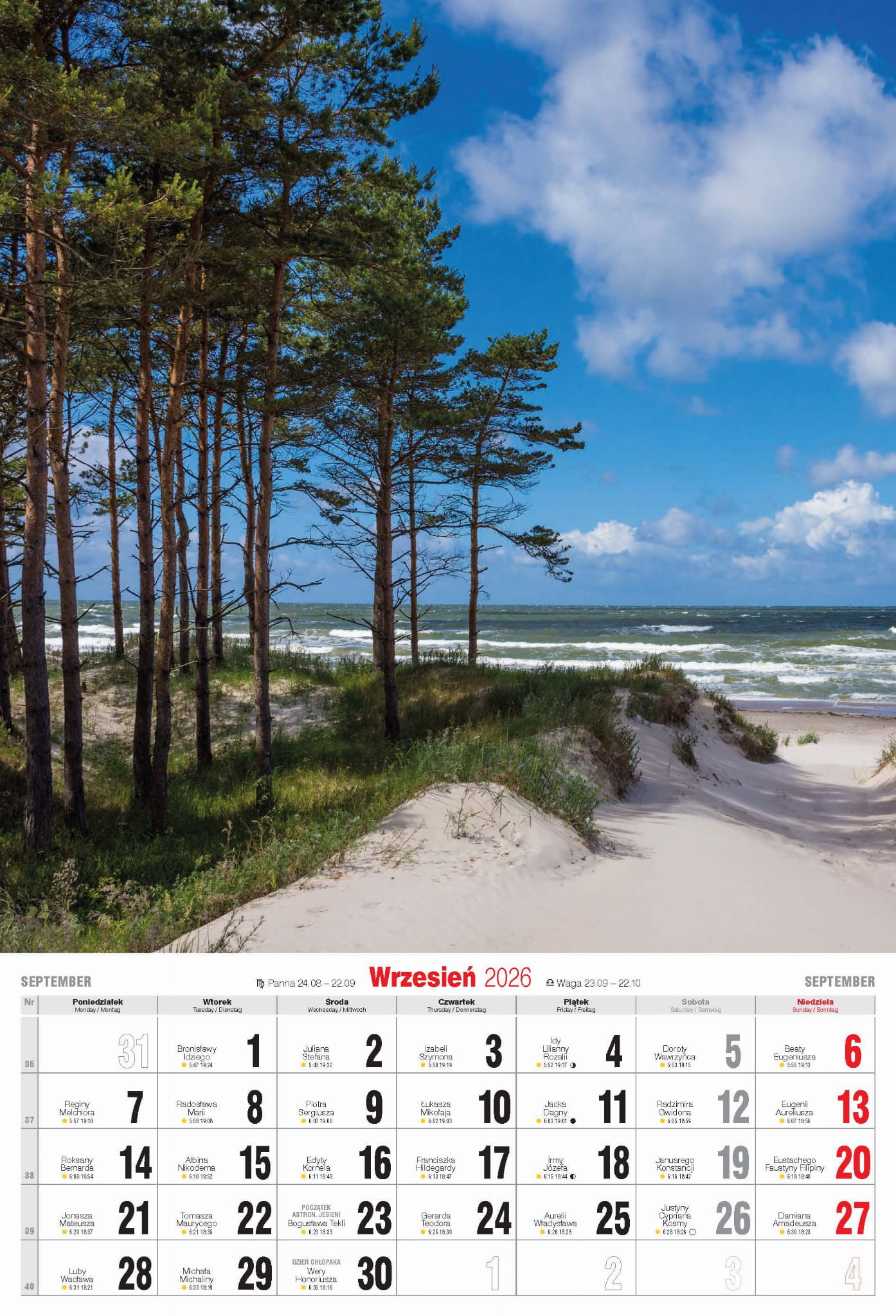 - nazwy miesięcy i dni tygodnia po polsku, angielsku i niemiecku