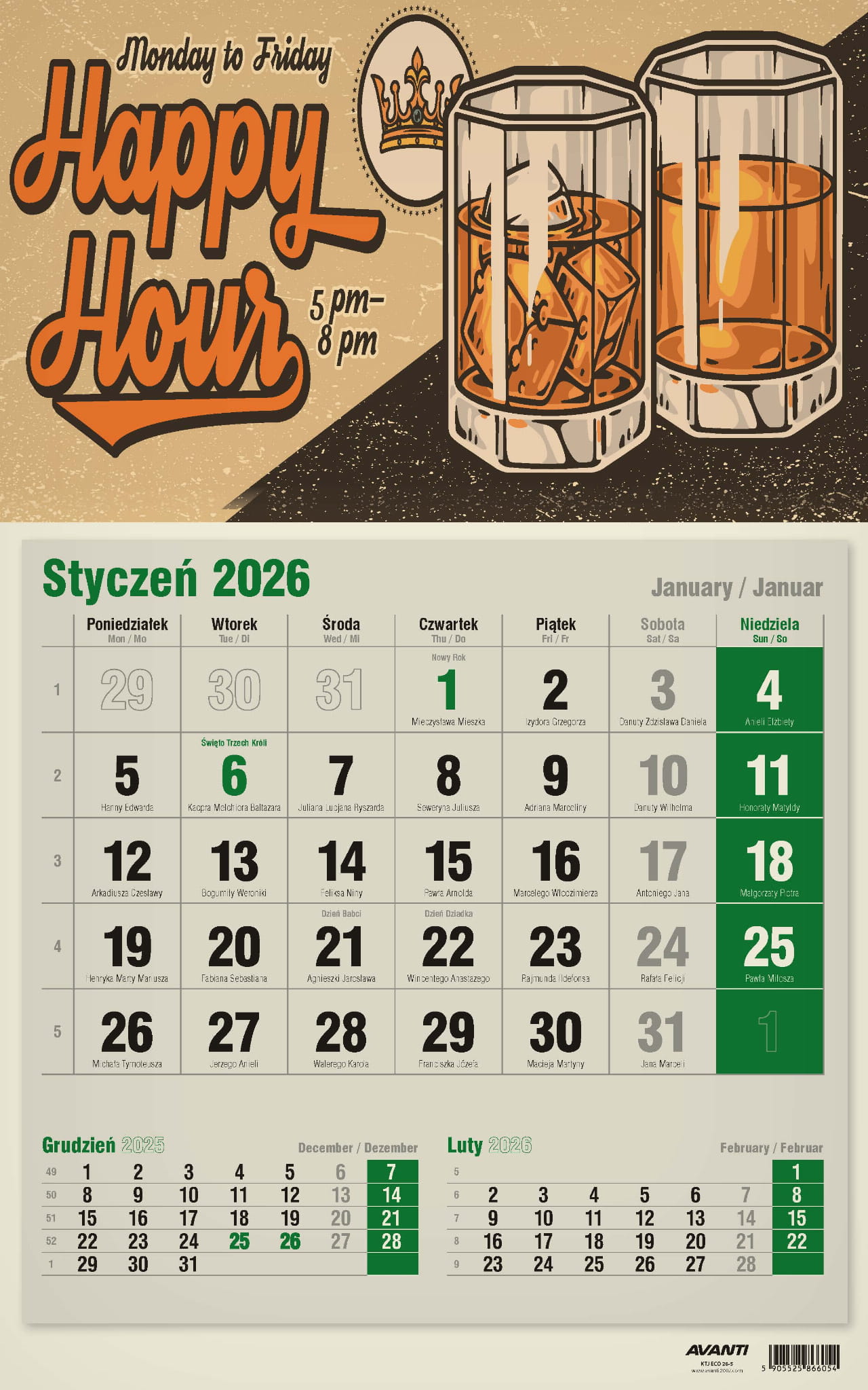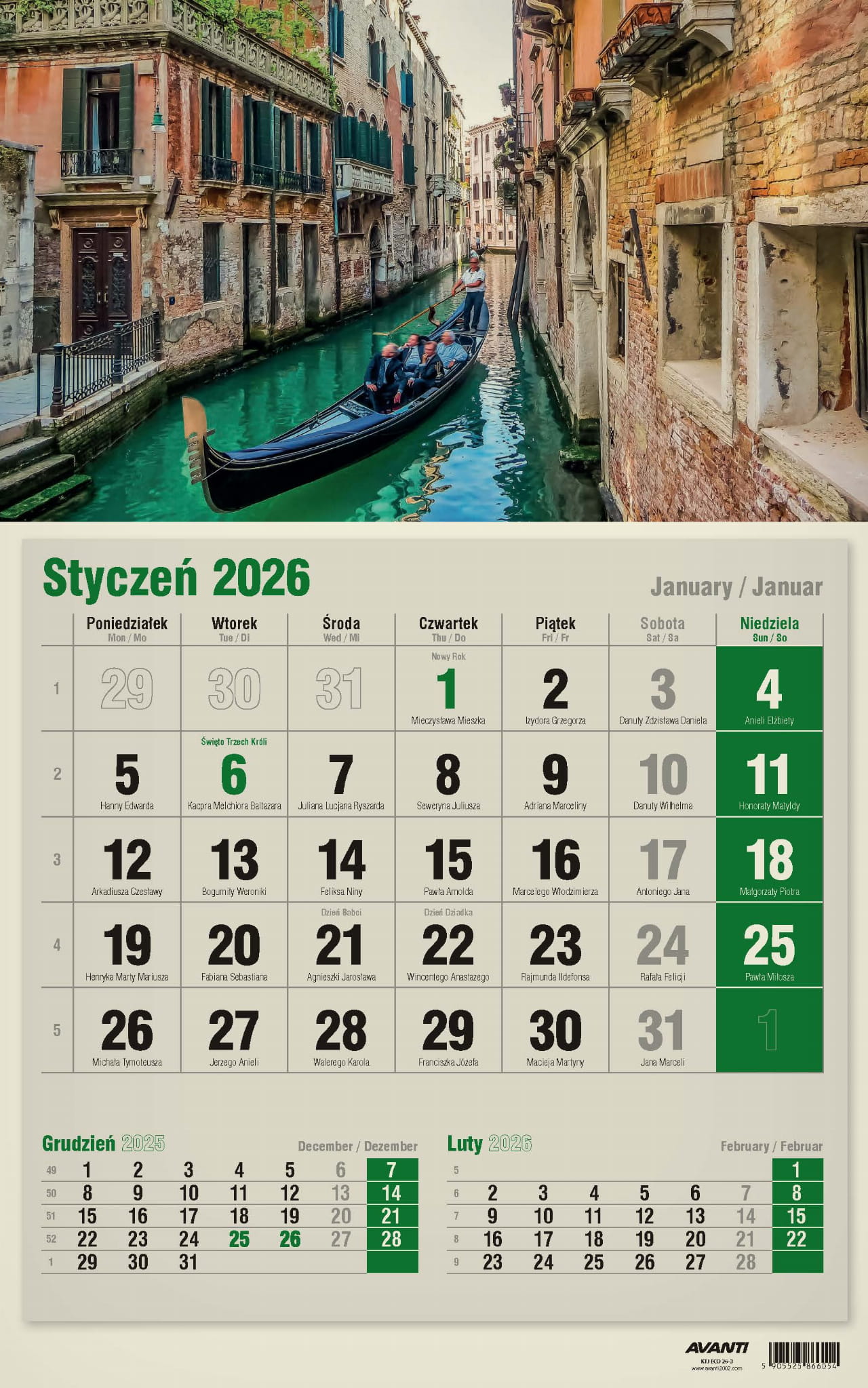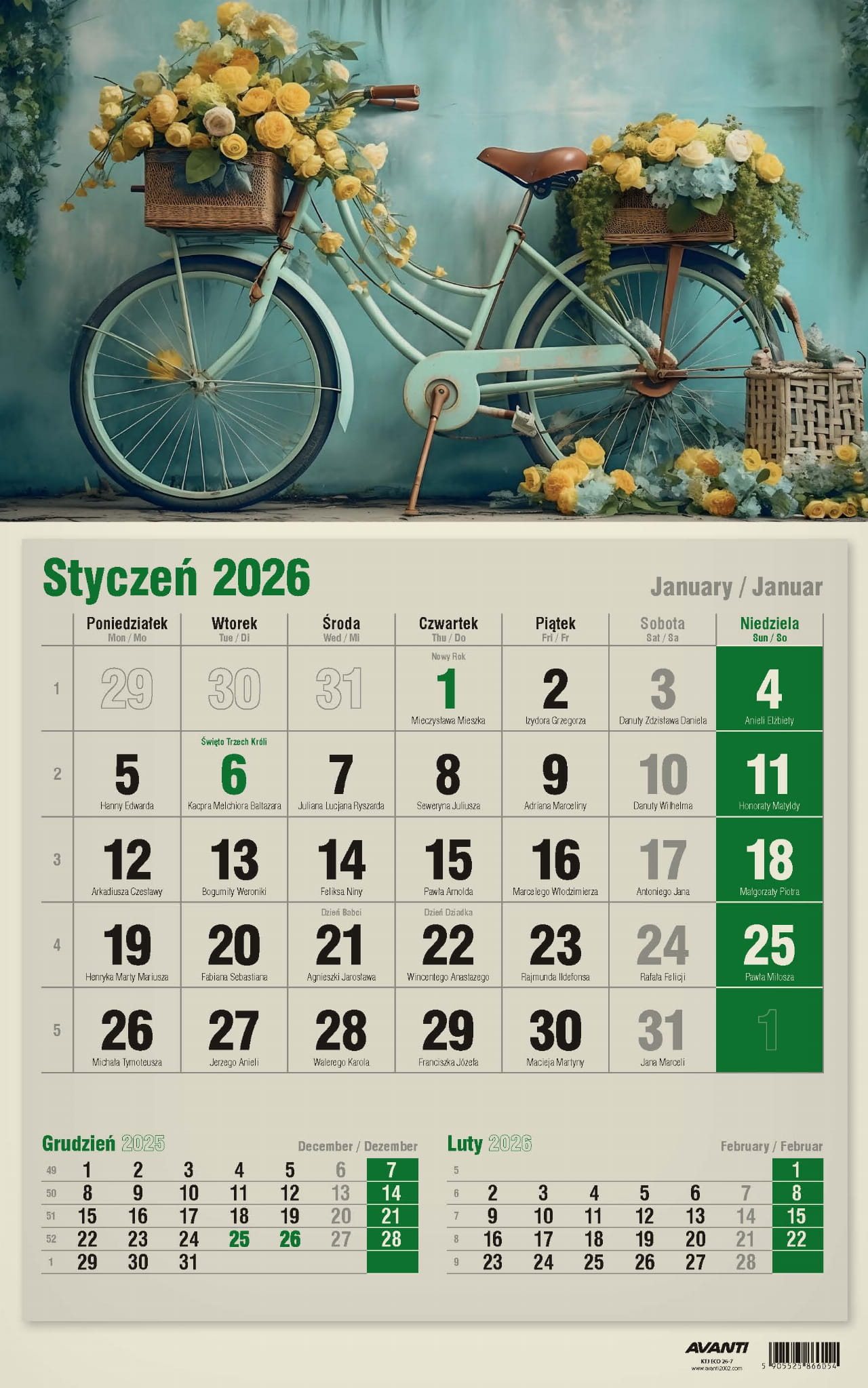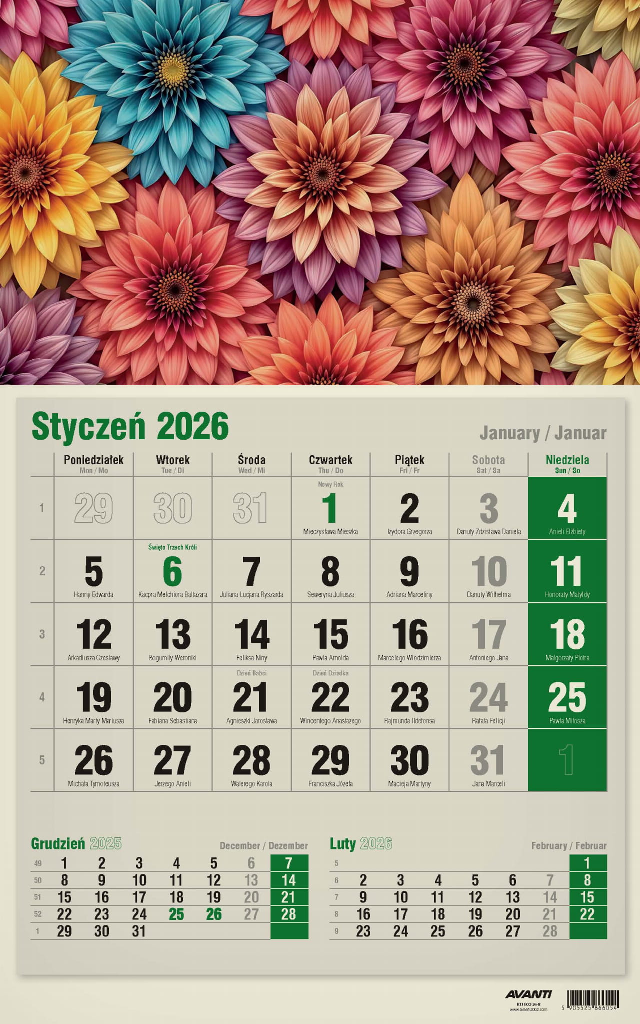 Kalendarz Jednodzielny pasuje wszędzie tam, gdzie na trójdzielny brakuje miejsca, a zależy nam na podglądzie poprzedniego i następnego miesiąca. Kalendaria zawierają oznaczenia miesięcy i dni tygodnia w trzech językach (PL, EN, DE) oraz imieniny i typowe święta. Drukowany na papierze typu Kraft (ekologicznym).