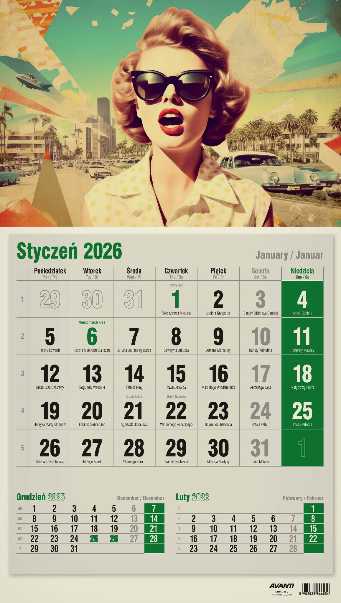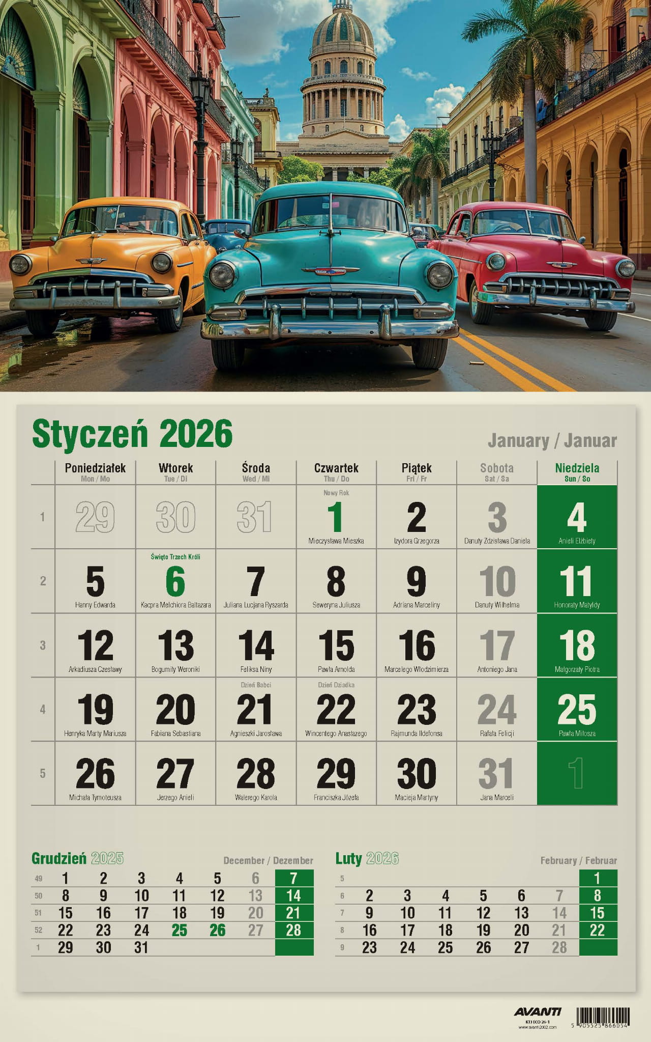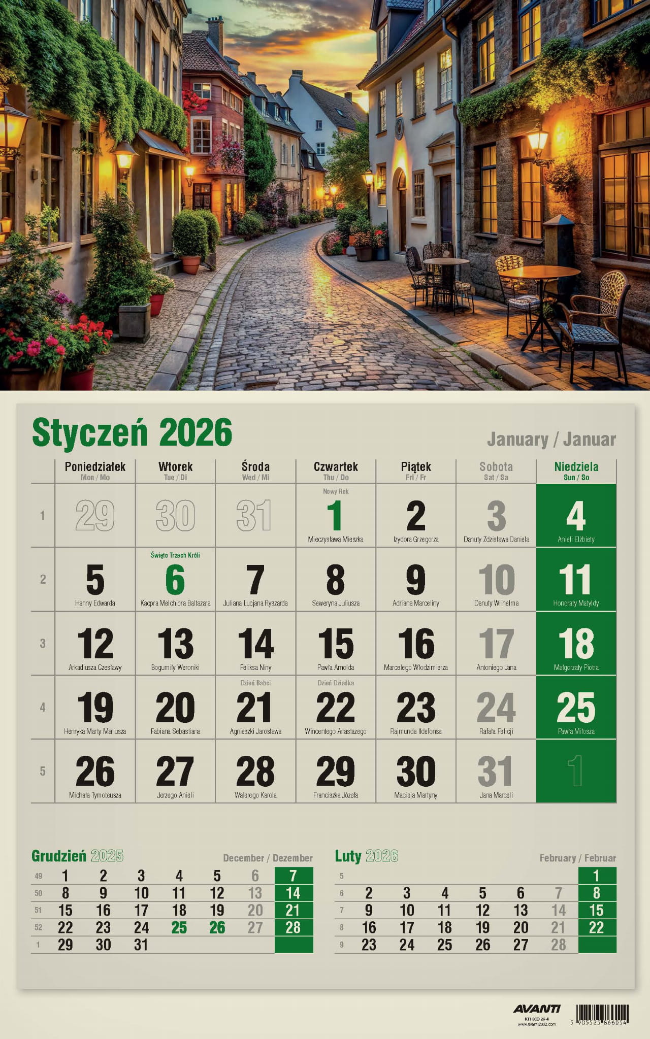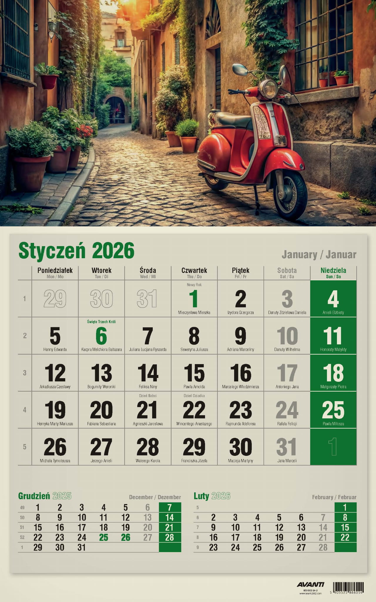 Kalendarz Jednodzielny pasuje wszędzie tam, gdzie na trójdzielny brakuje miejsca, a zależy nam na podglądzie poprzedniego i następnego miesiąca. Kalendaria zawierają oznaczenia miesięcy i dni tygodnia w trzech językach (PL, EN, DE) oraz imieniny i typowe święta. Drukowany na papierze typu Kraft (ekologicznym).