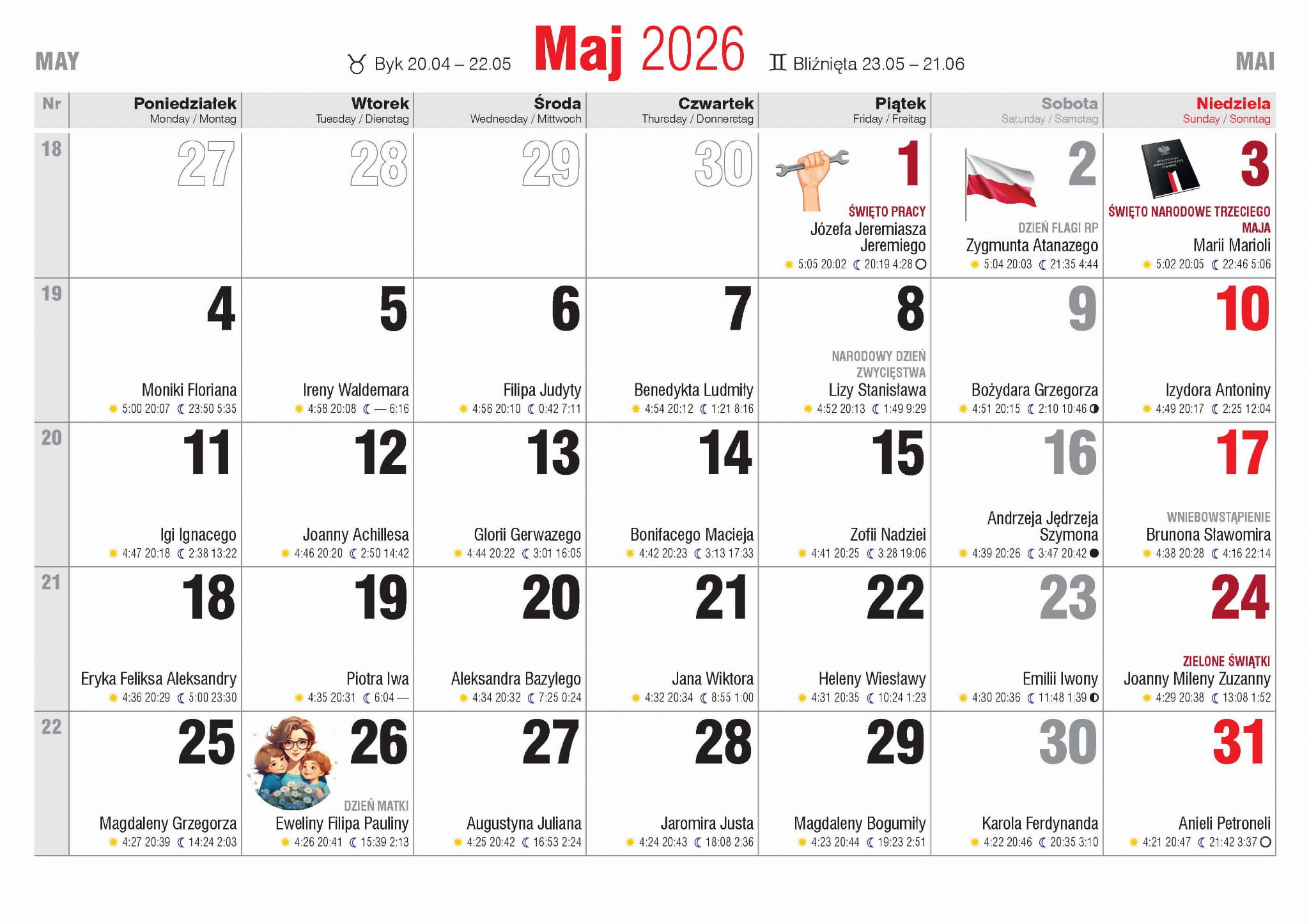 - nazwy miesięcy i dni tygodnia po polsku, angielsku i niemiecku