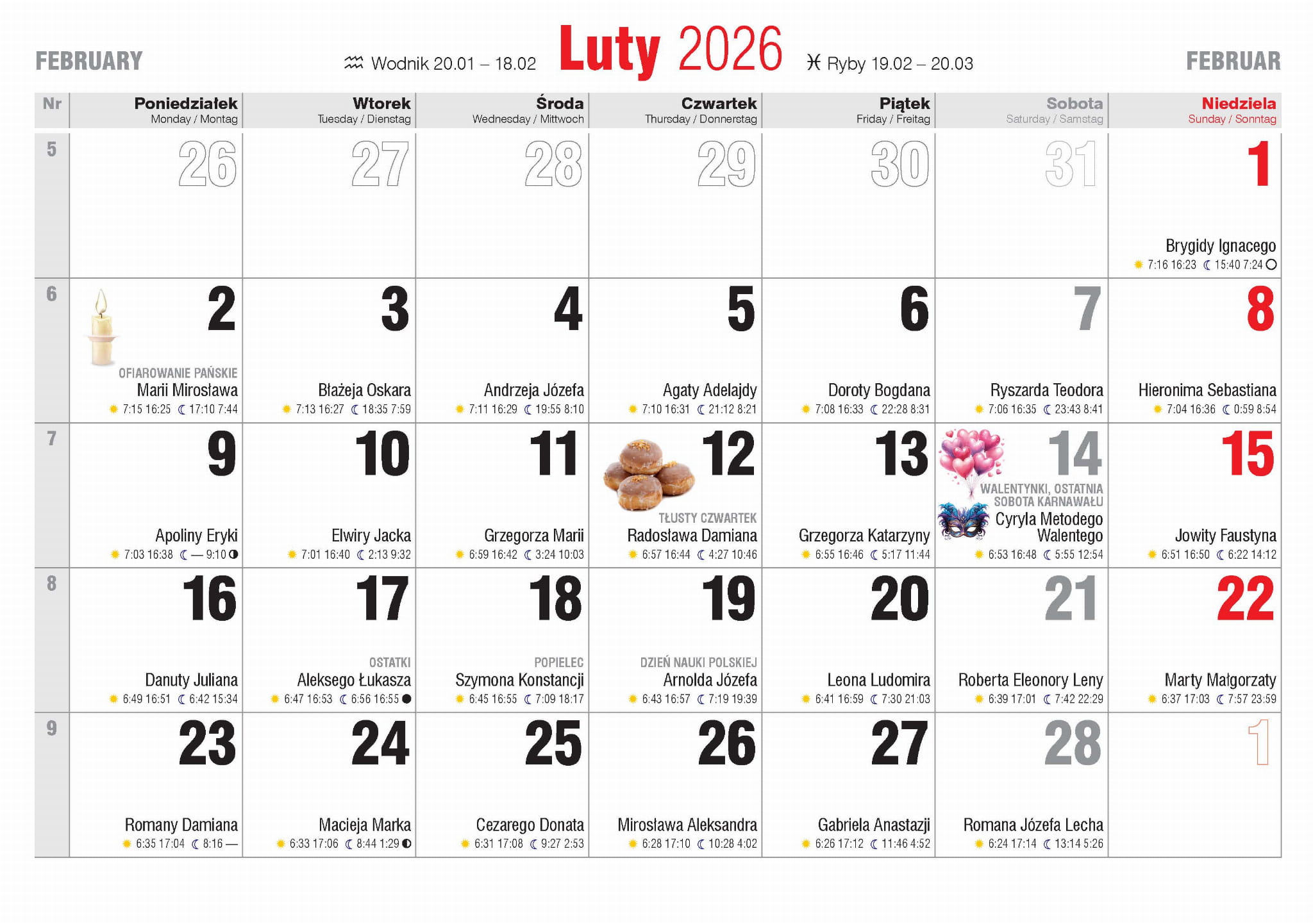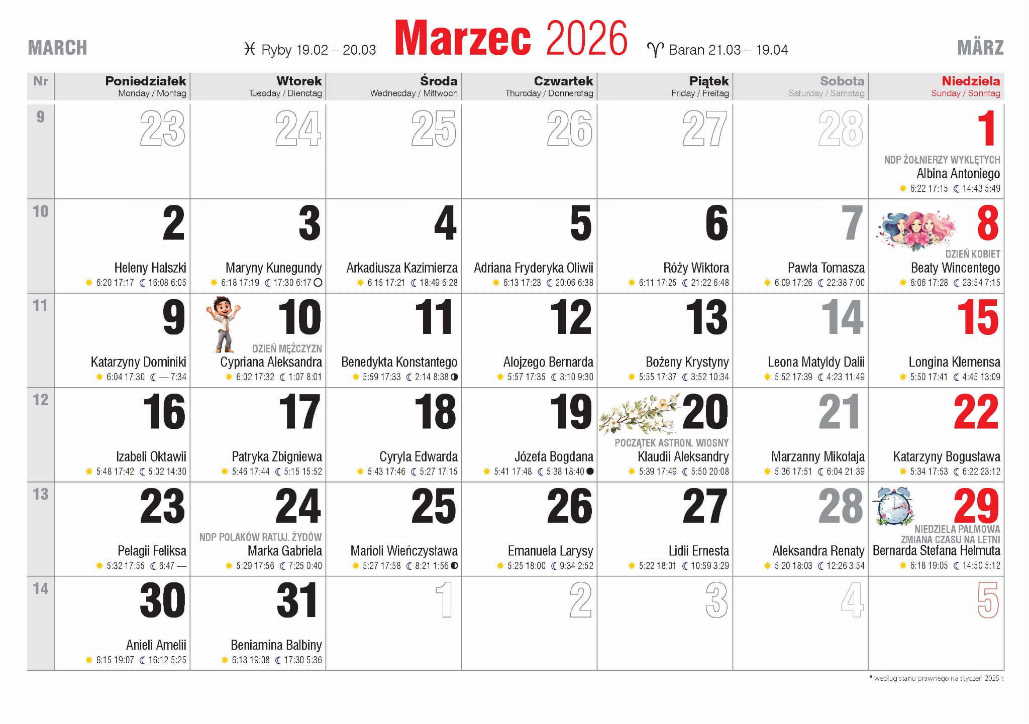 - nazwy miesięcy i dni tygodnia po polsku, angielsku i niemiecku