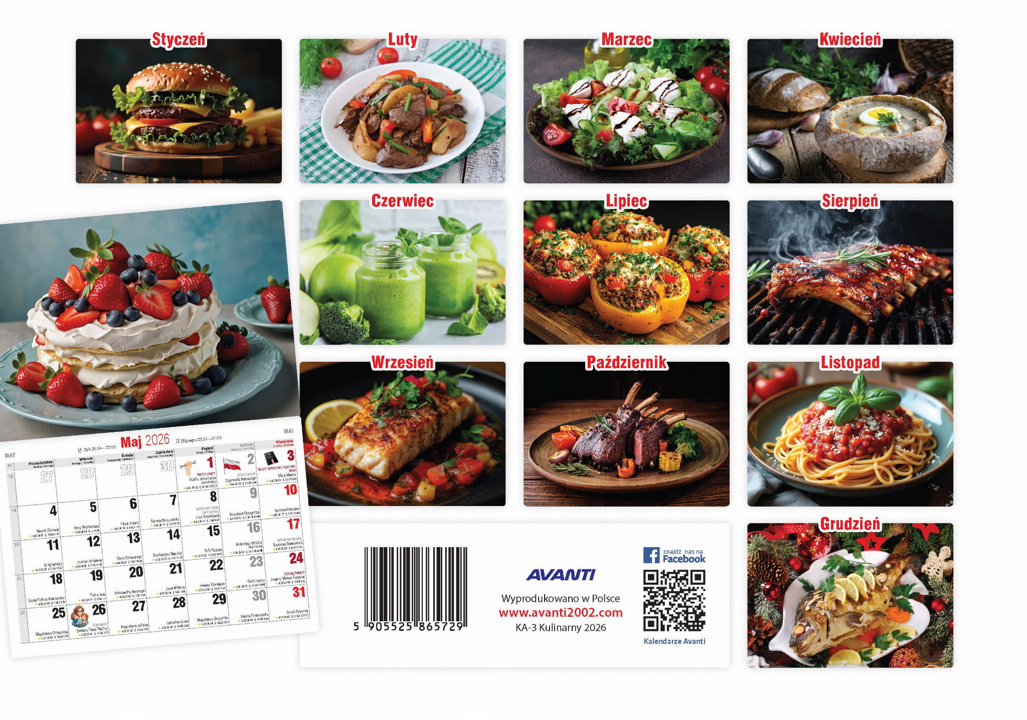 Rozkładany kalendarz ścienny, drukowany na papierze kredowym.