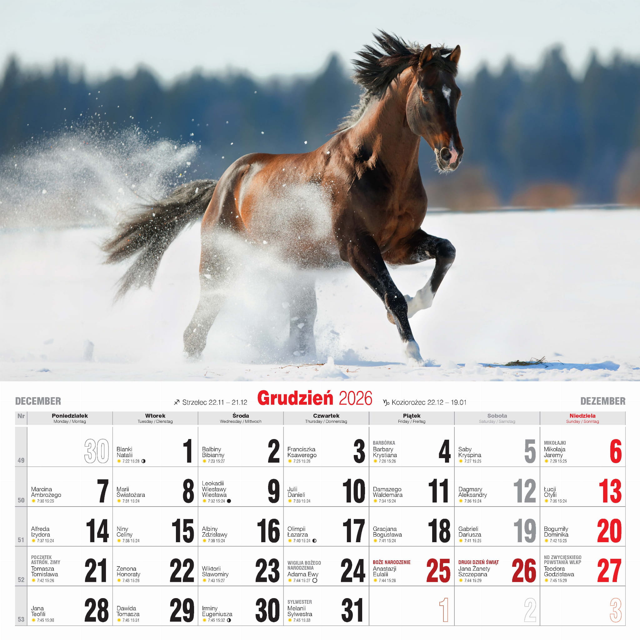 - nazwy miesięcy i dni tygodnia po polsku, angielsku i niemiecku