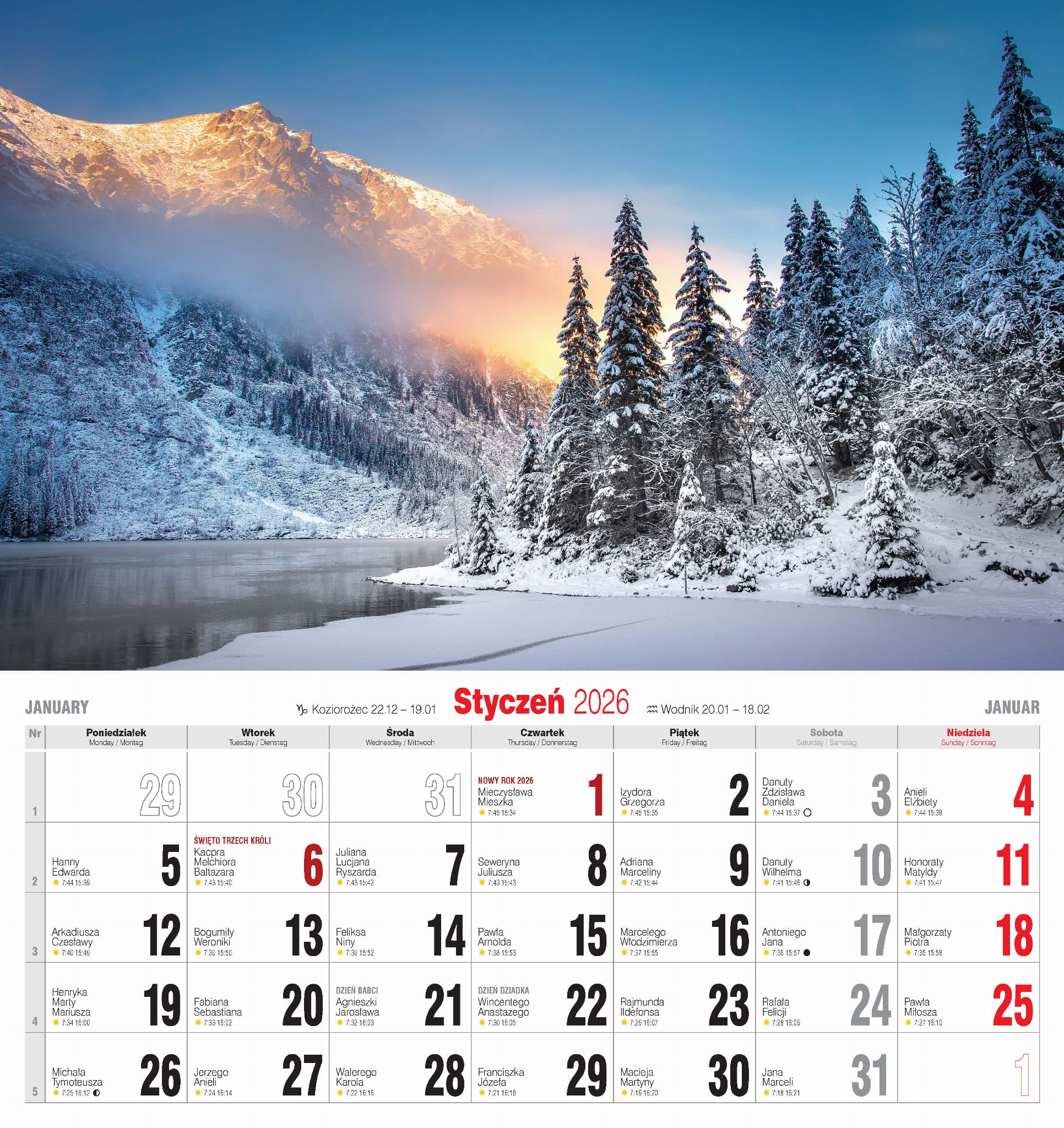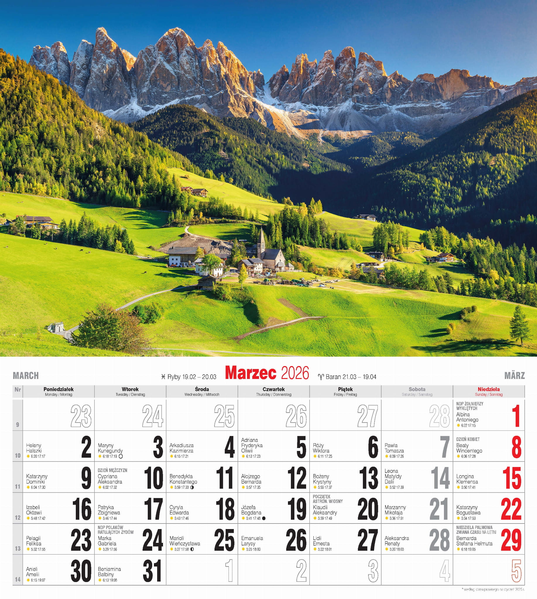 Duży, solidny kalendarz ścienny, drukowany na papierze kredowym.