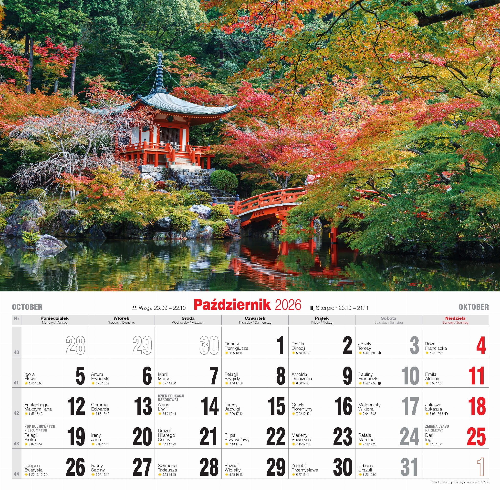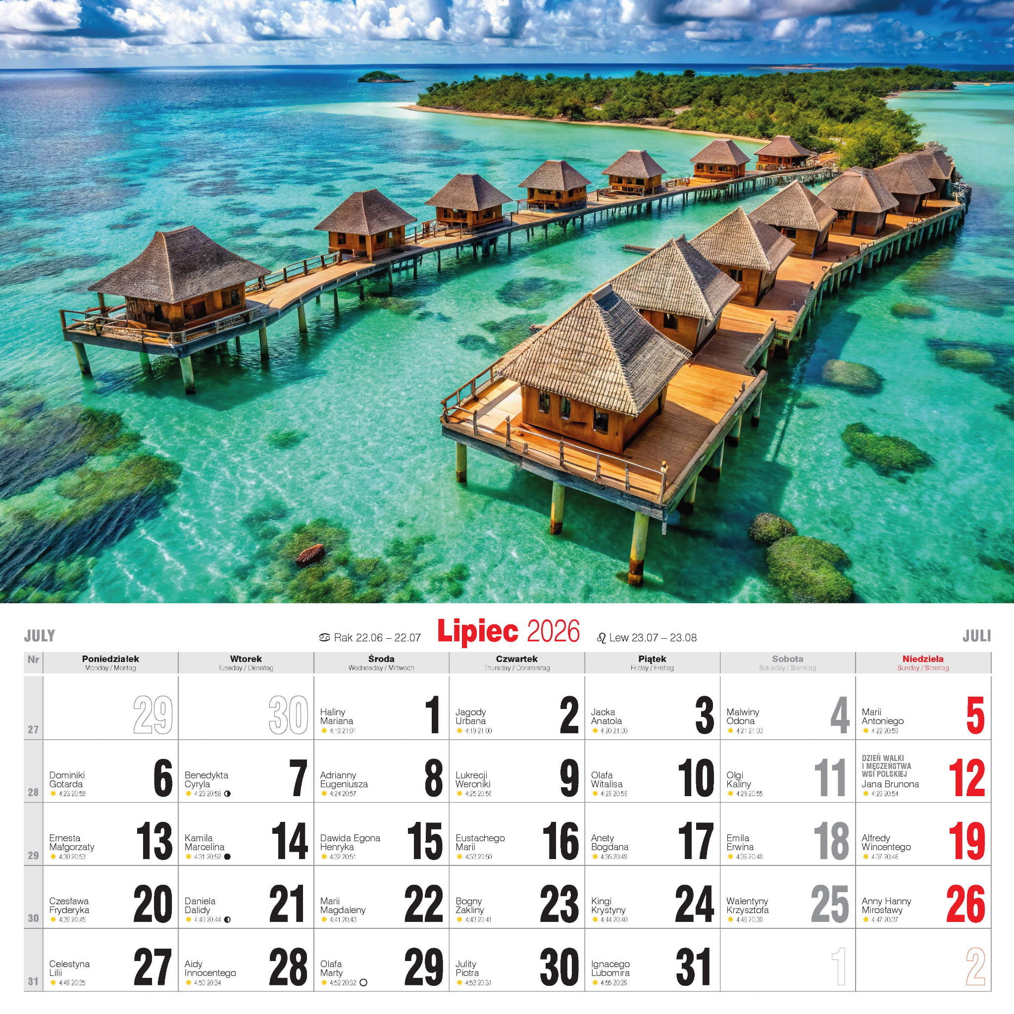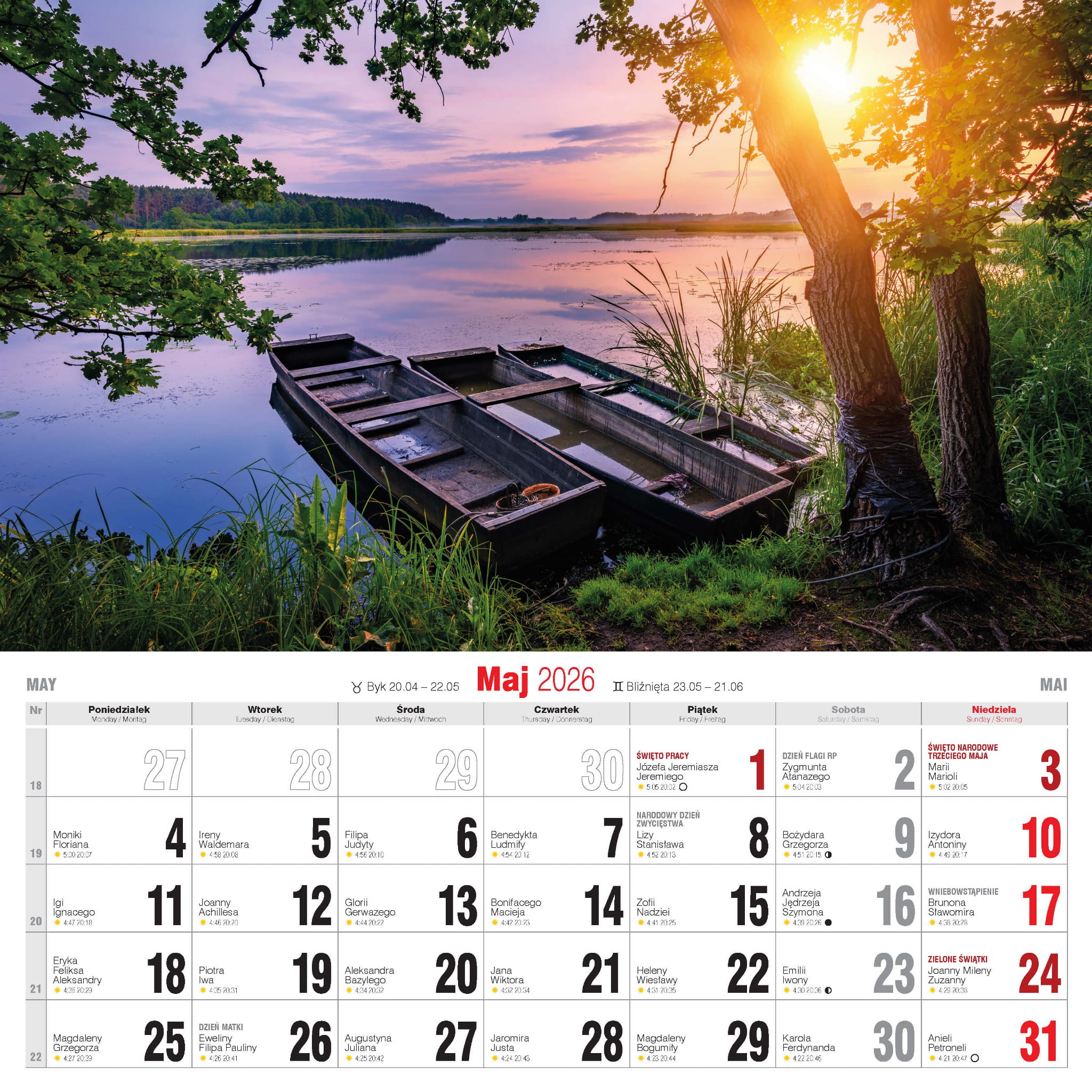 - nazwy miesięcy i dni tygodnia po polsku, angielsku i niemiecku