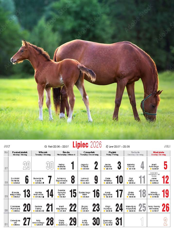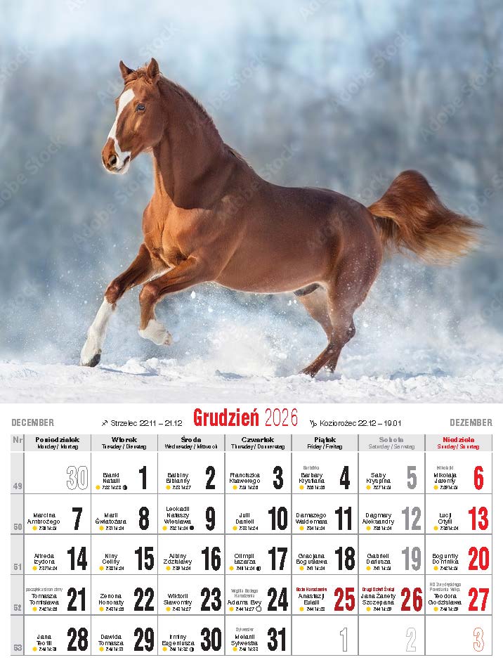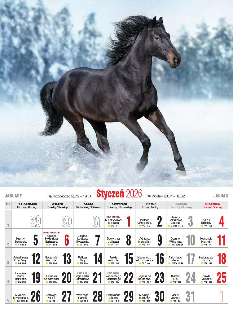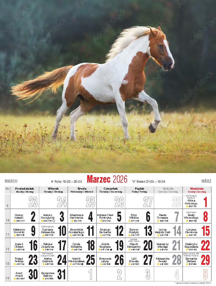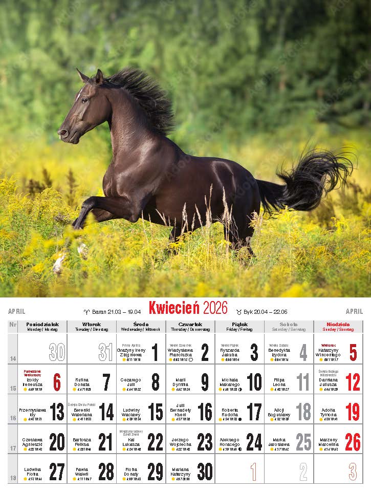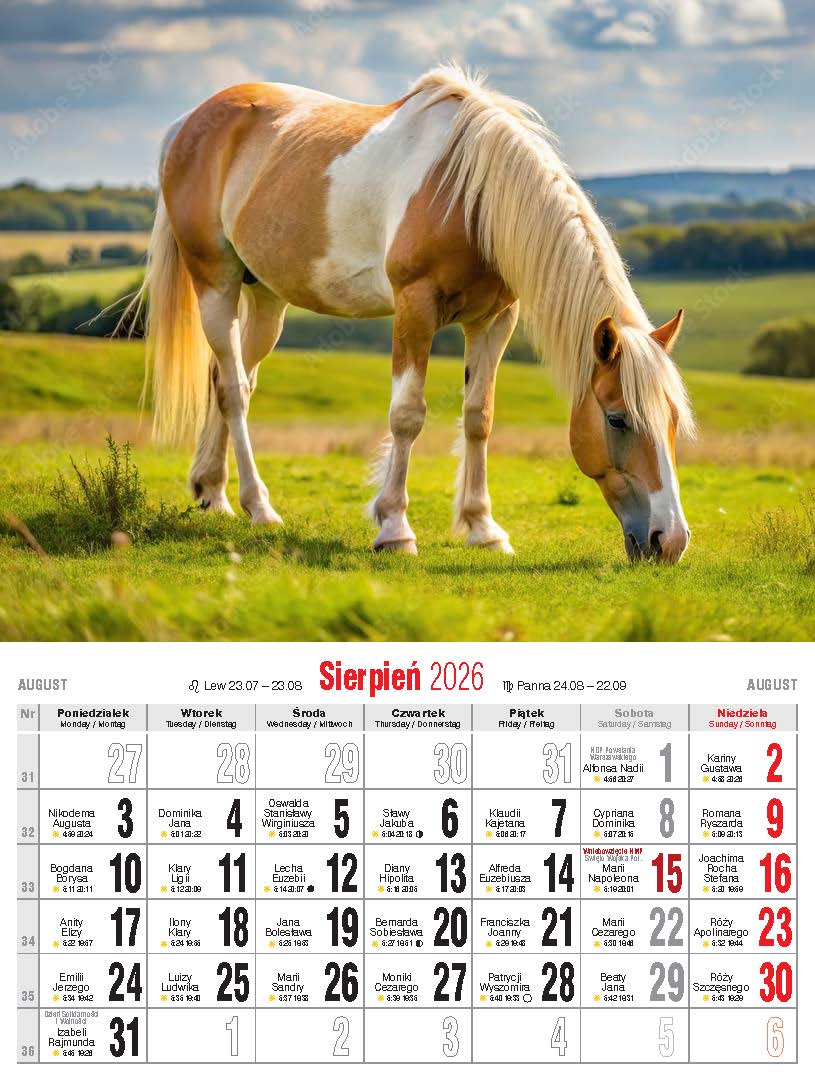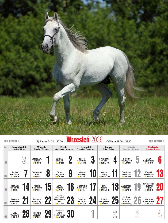 Wygodny, niewielki kalendarz ścienny, drukowany na papierze kredowym.