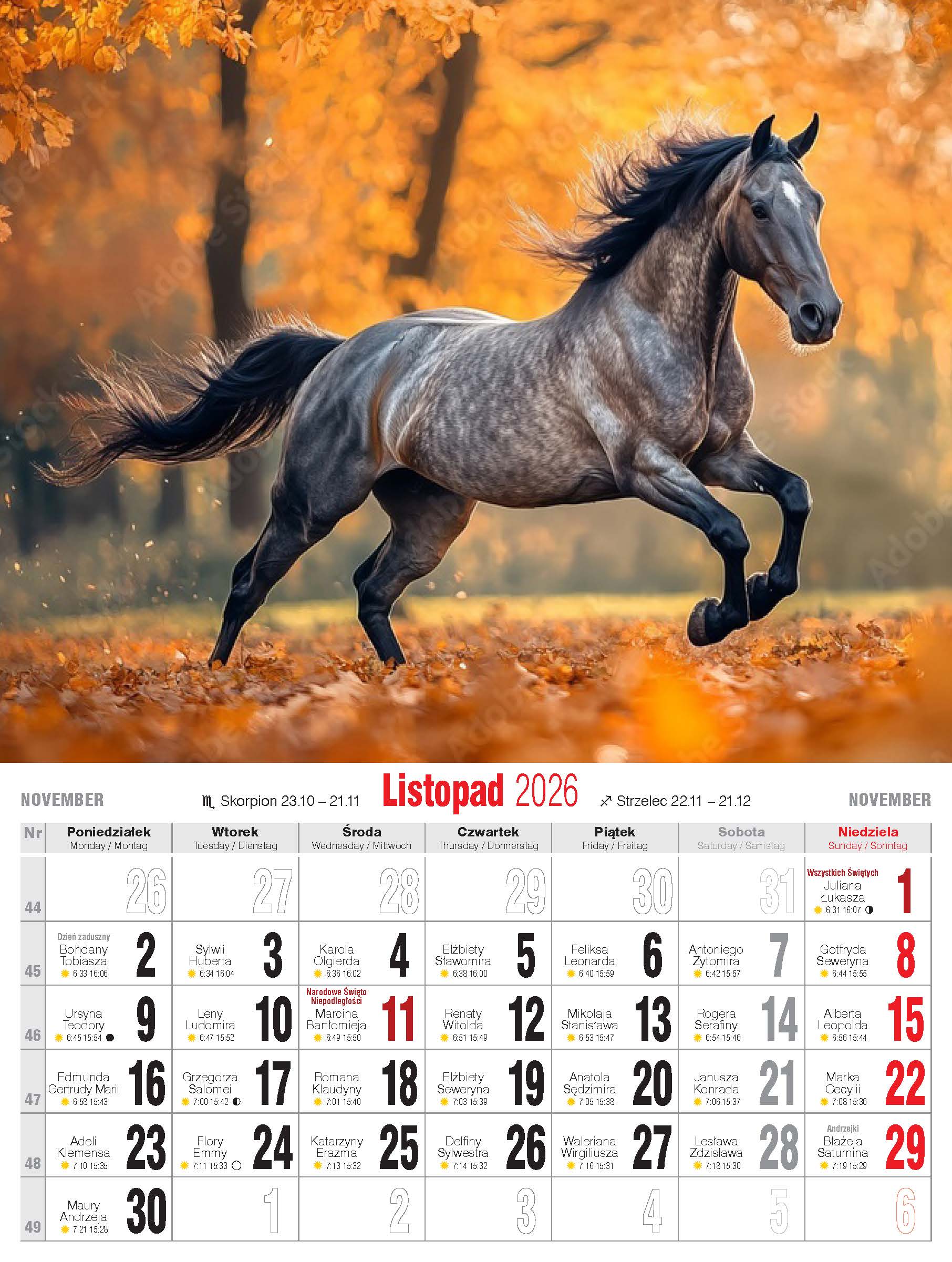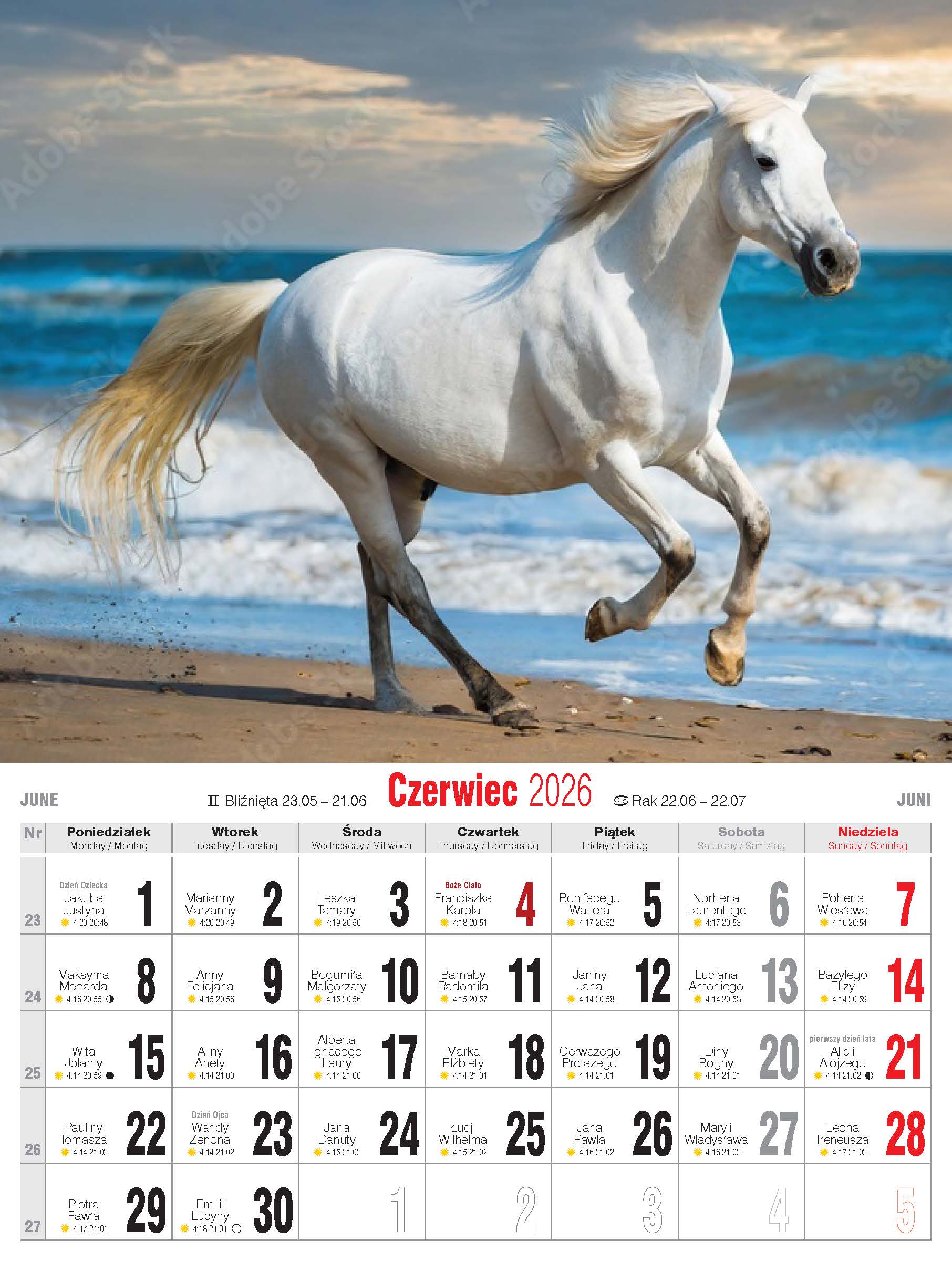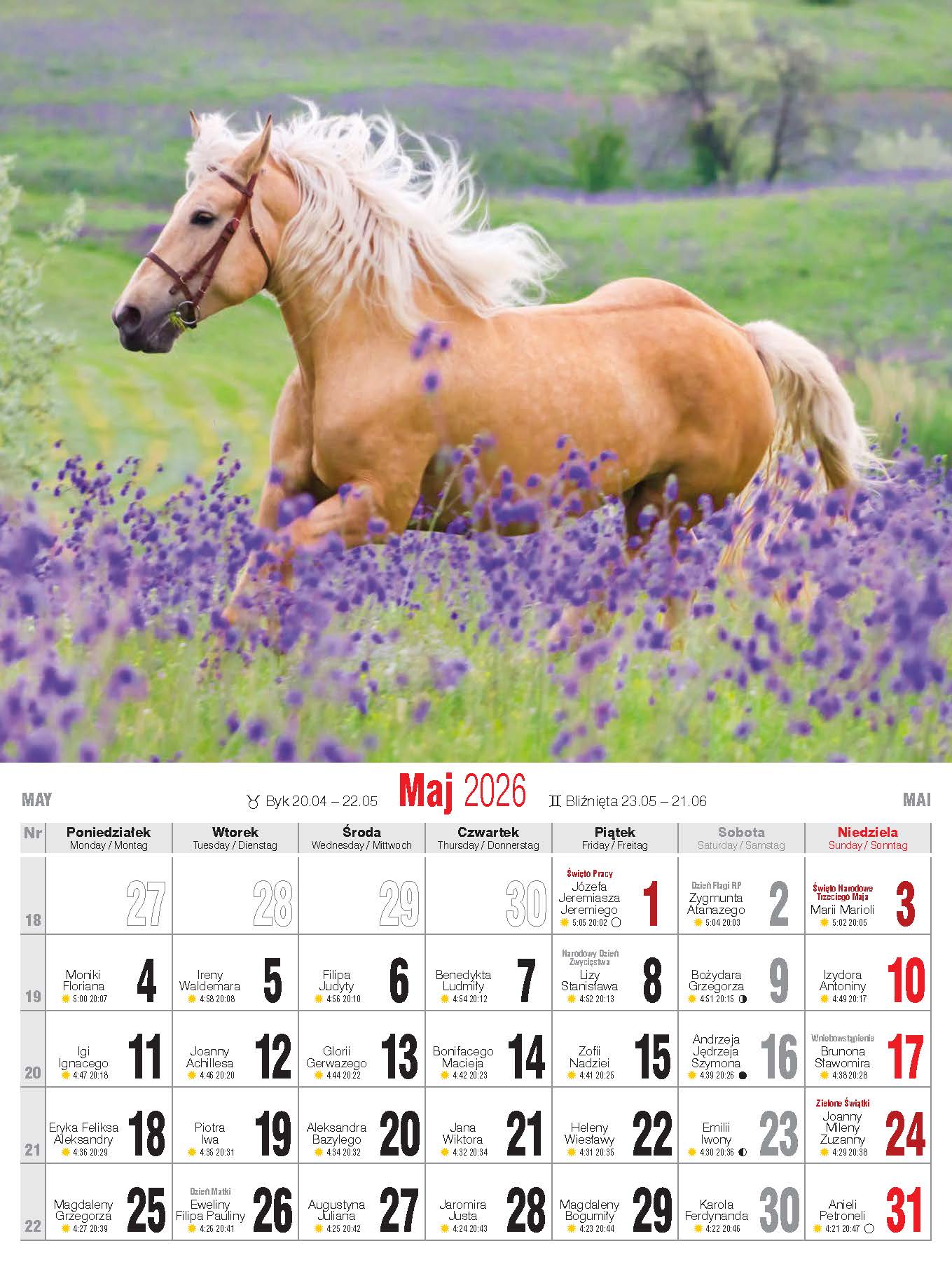 - nazwy miesięcy i dni tygodnia po polsku, angielsku i niemiecku