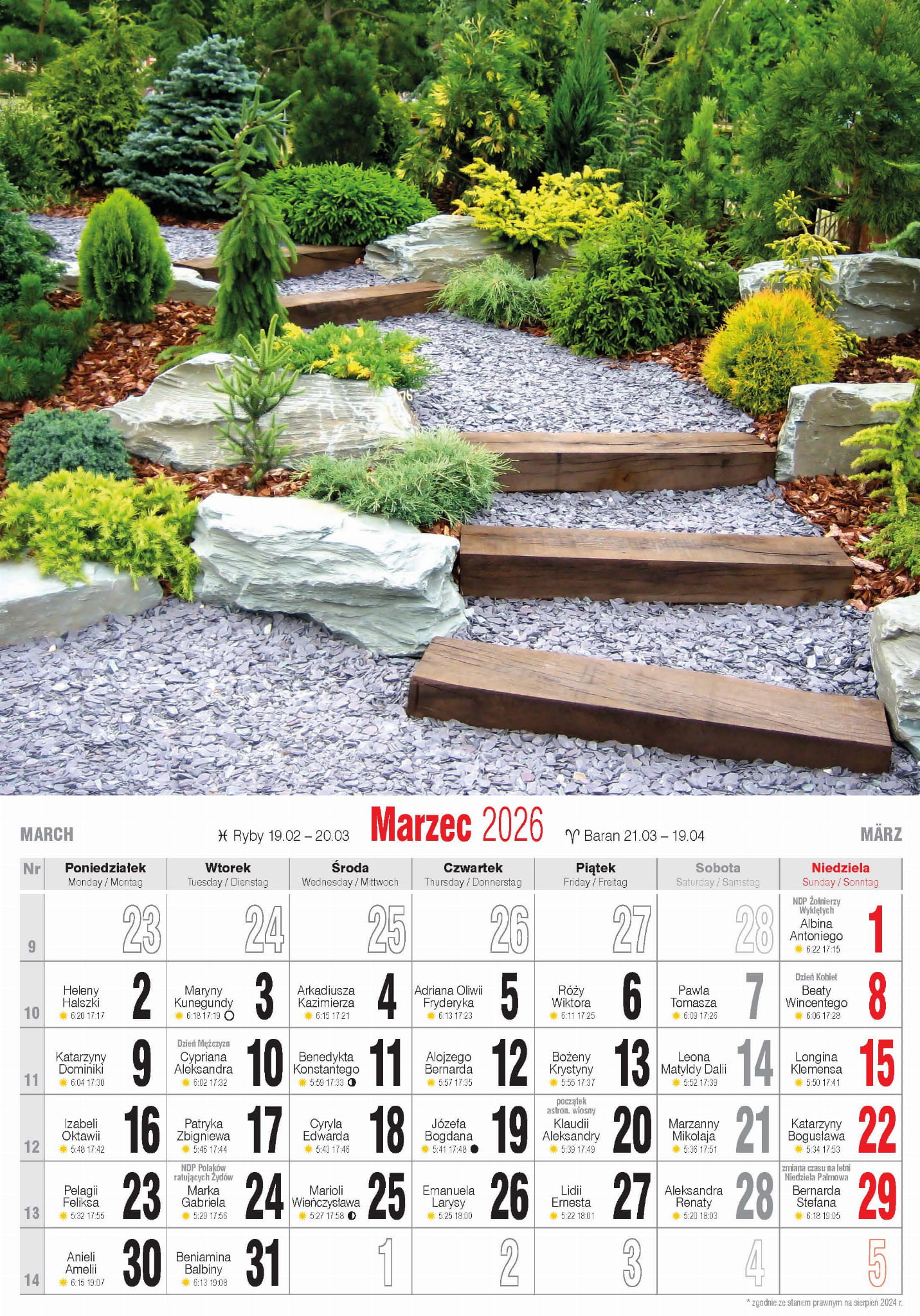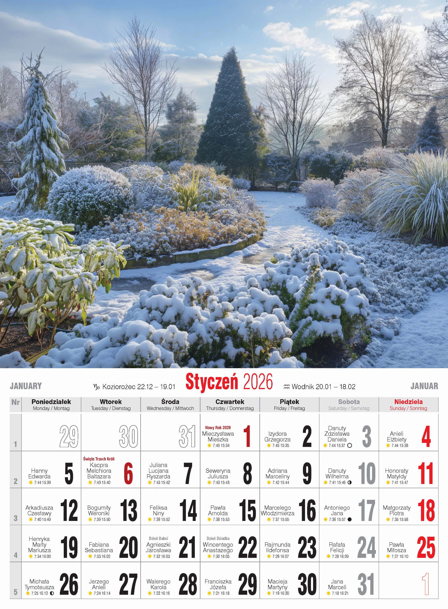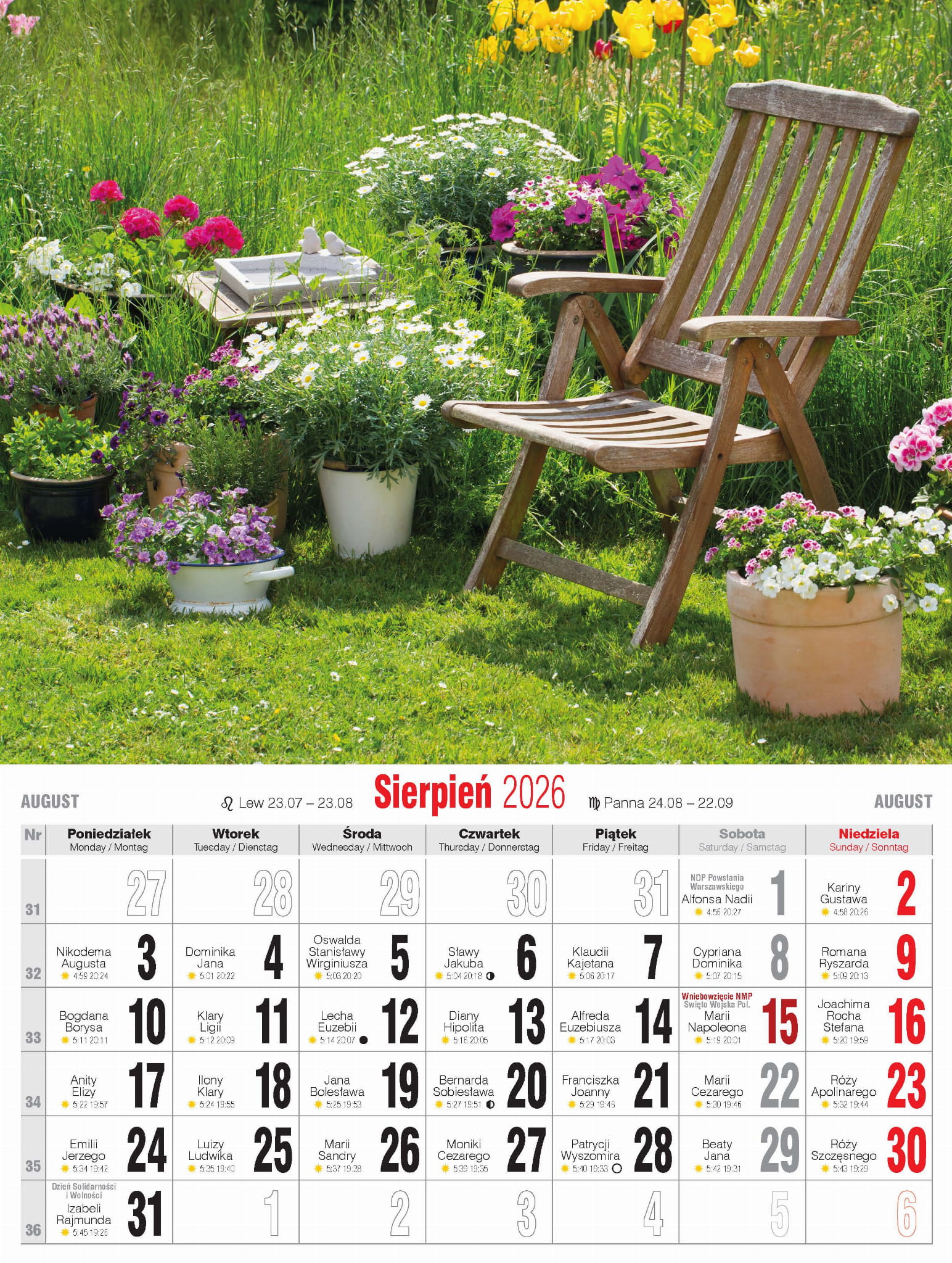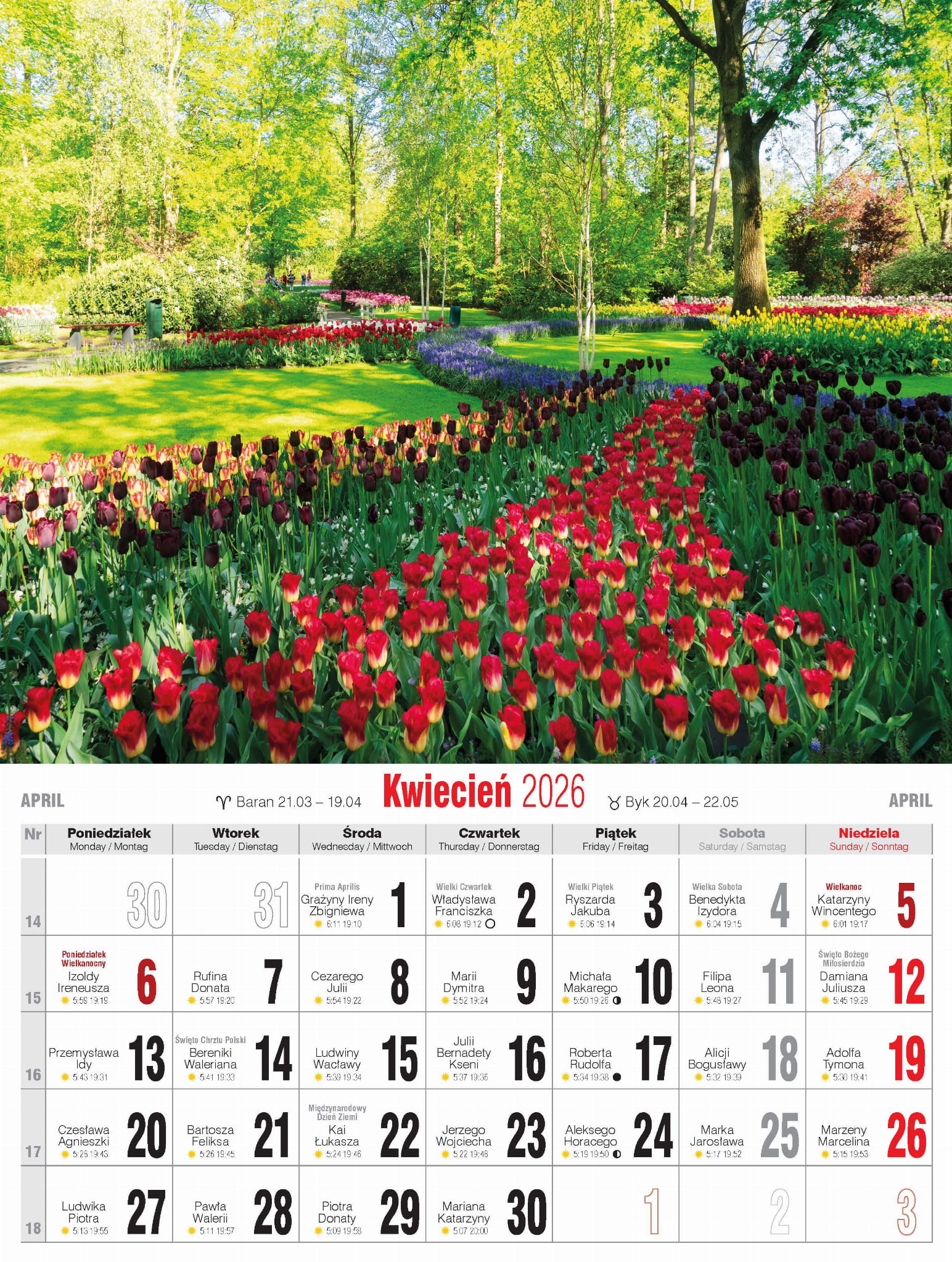 Wygodny, niewielki kalendarz ścienny, drukowany na papierze kredowym w oprawie spiralnej.