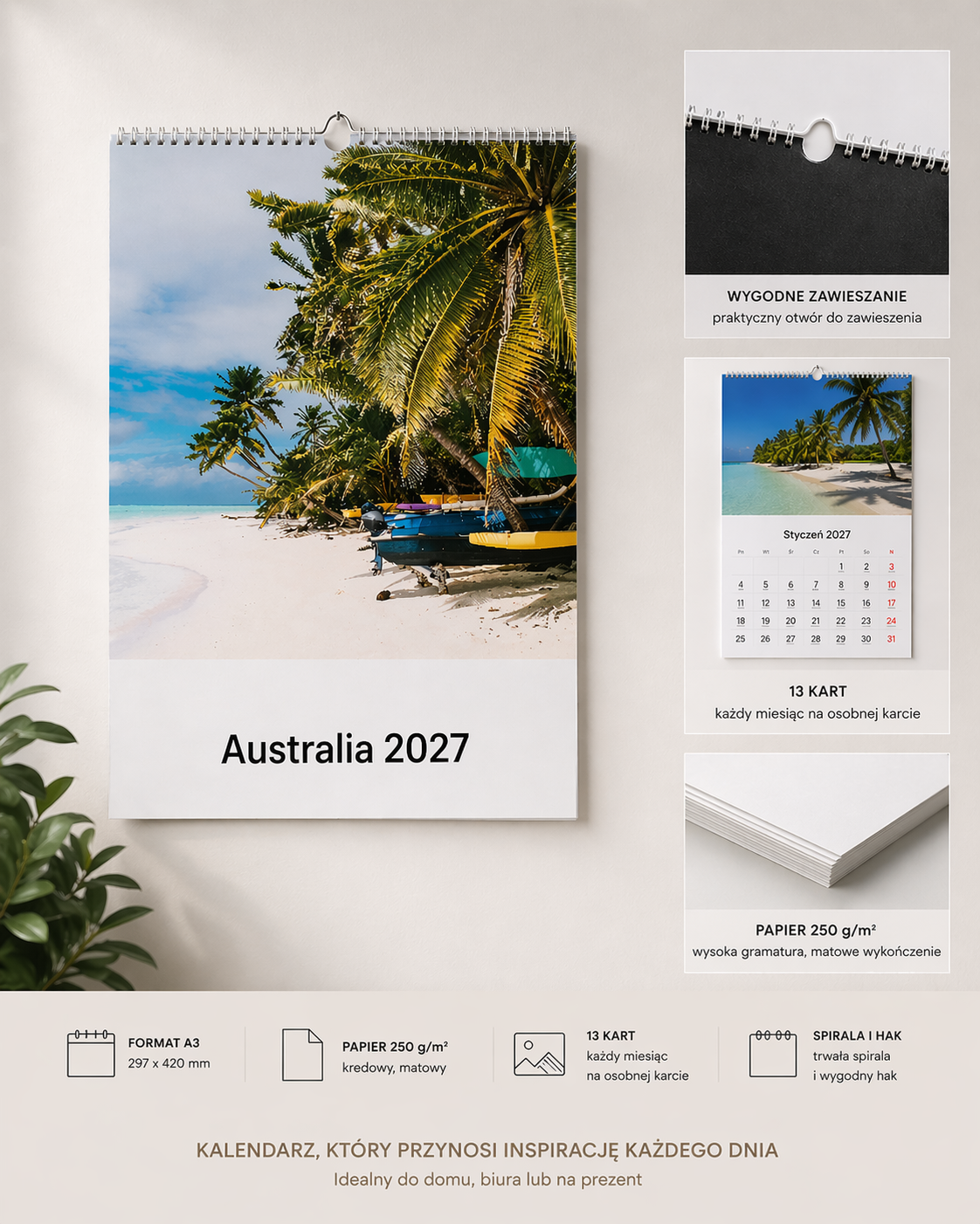 Stwórz wyjątkowy kalendarz ścienny ze swoimi zdjęciami i ciesz się najpiękniejszymi wspomnieniami przez cały rok. Każdy miesiąc to nowa karta z fotografią, która nadaje wnętrzu osobisty i unikalny charakter.